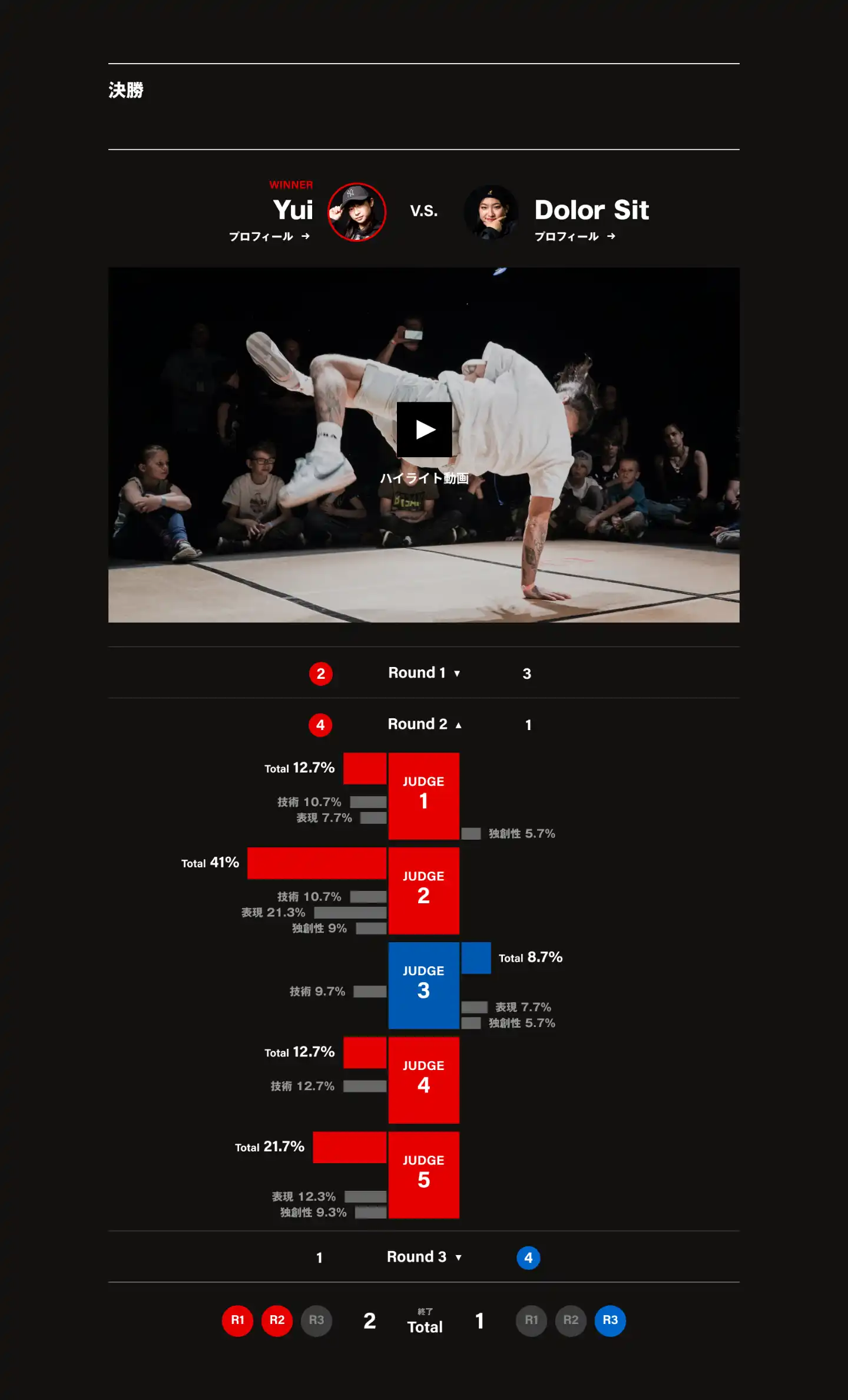 The website delivers real-time competition updates with engaging contents, including battle videos, detailed results, and tournament information. The score board visualizes complex judging system in a clear and easy-to-understand manner.